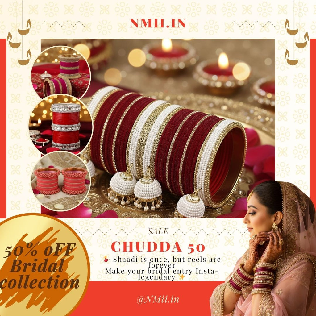 Bridal Red & White Chuda with Golden Detailing and Pearl Latkans – Set of 2