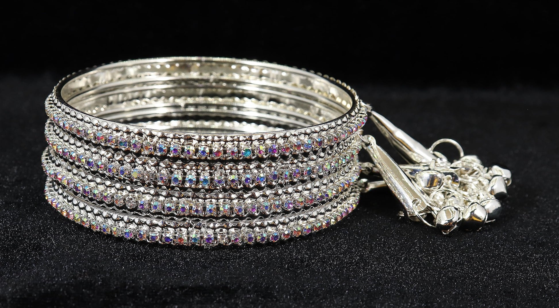 Silver Alloy Metal Latkan Bangles Set for Women & Girls | Zircon Studded with Bells | Pack of 4