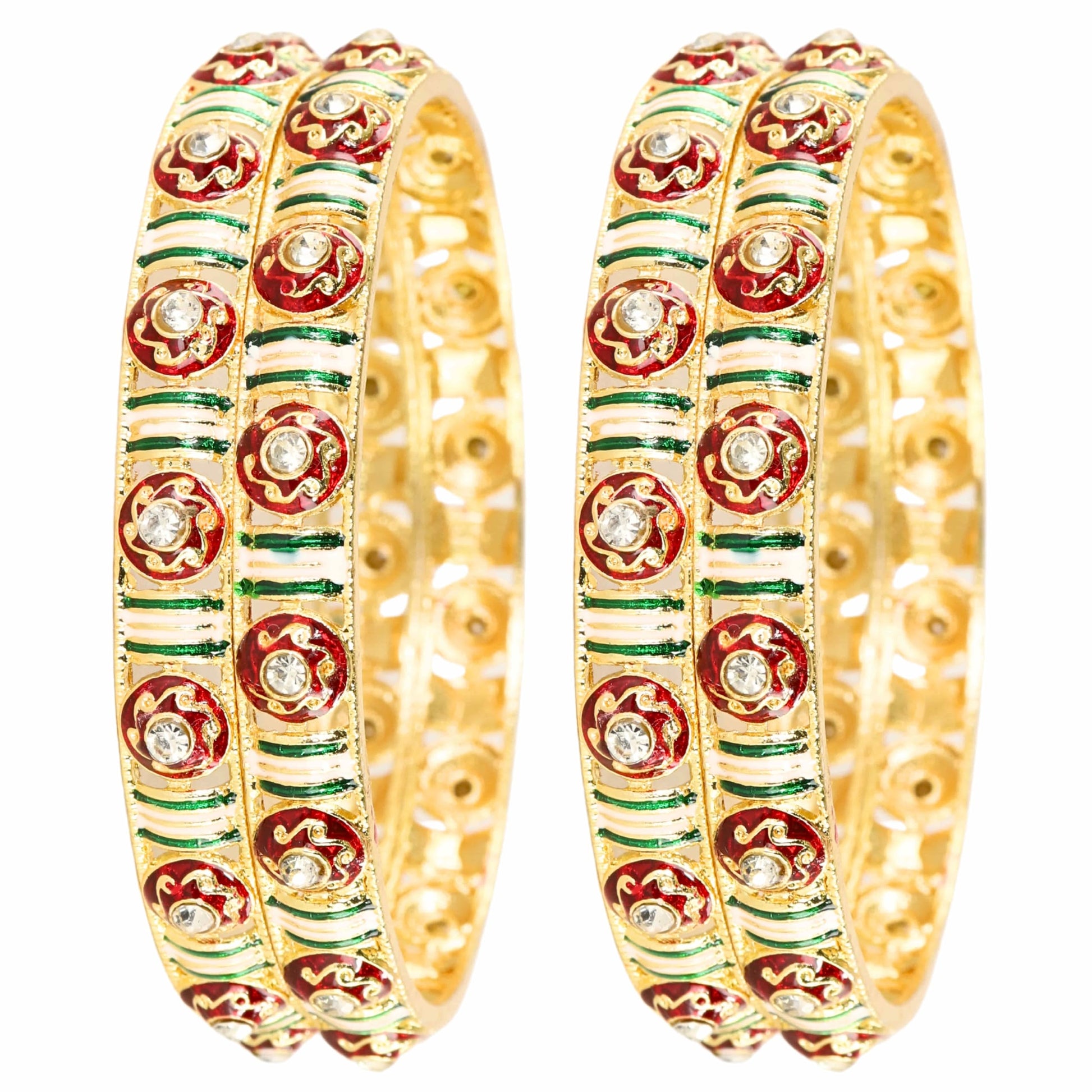 Golden Metal Kada Bangles with Red & Green Enamel Floral Design – Pack of 4