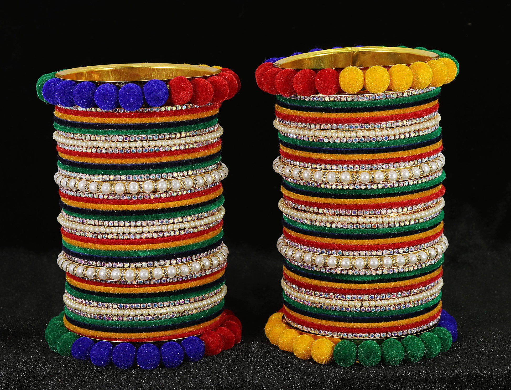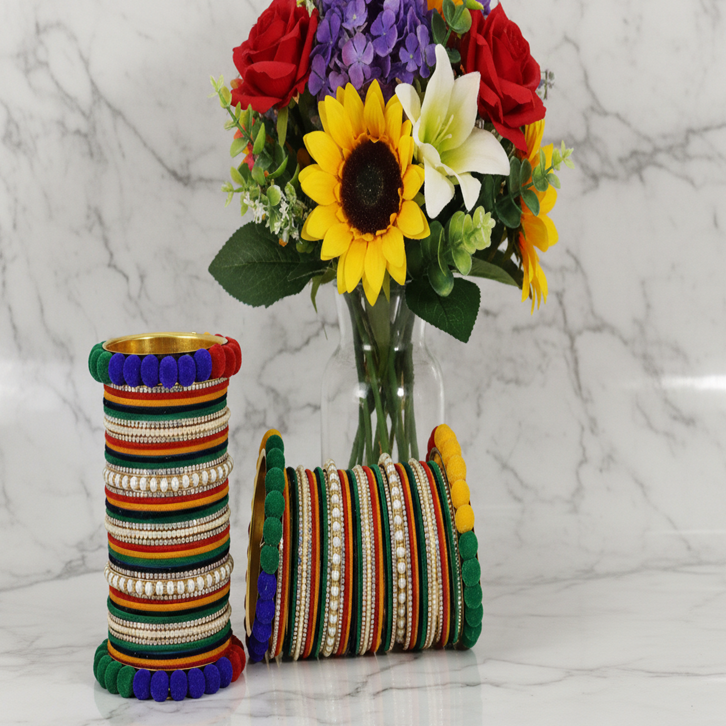 A vibrant Multicolor Velvet Bridal Chuda designed for both hands, blending rich velvet shades with sparkling zircon and bead detailing. Perfect for weddings, festive occasions, and traditional celebrations.