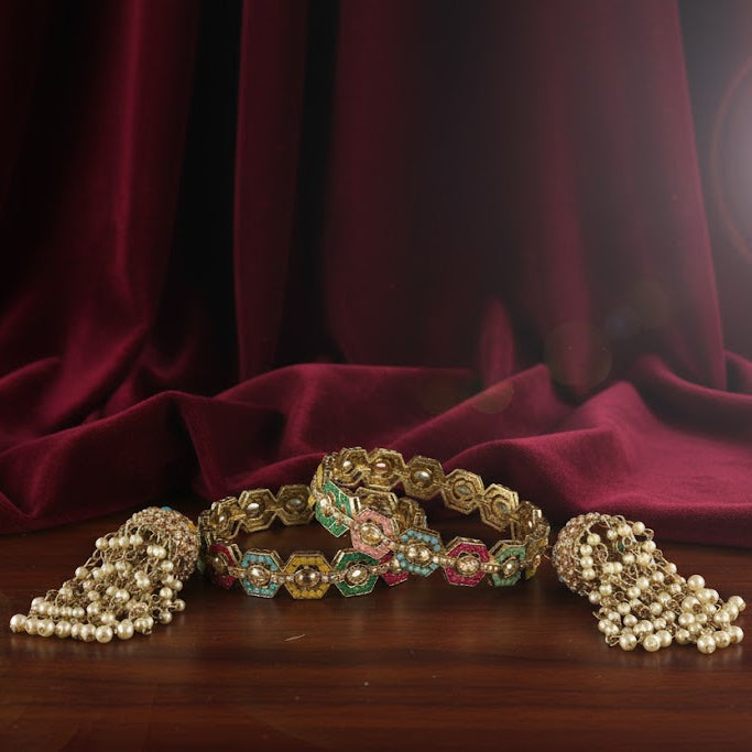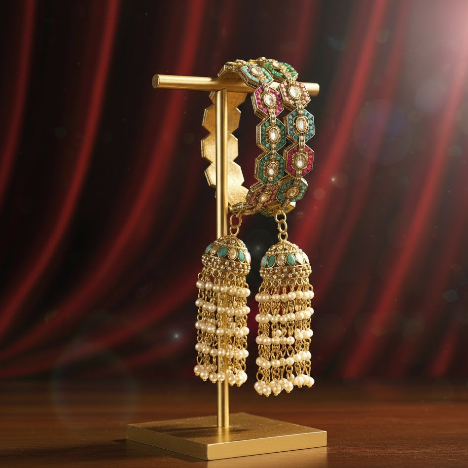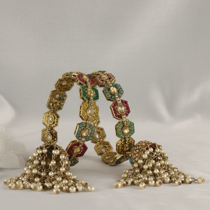 Enhance your ethnic elegance with this stunning Rajwadi-style bangle set featuring elegant latkan jhumka kaliras. Crafted from premium metal, these kadas are embellished with white moti pearls and multi-color stones that add a regal charm to your traditional attire. Perfect for bridal wear, weddings, and festive occasions, this pair blends timeless craftsmanship with royal sophistication.